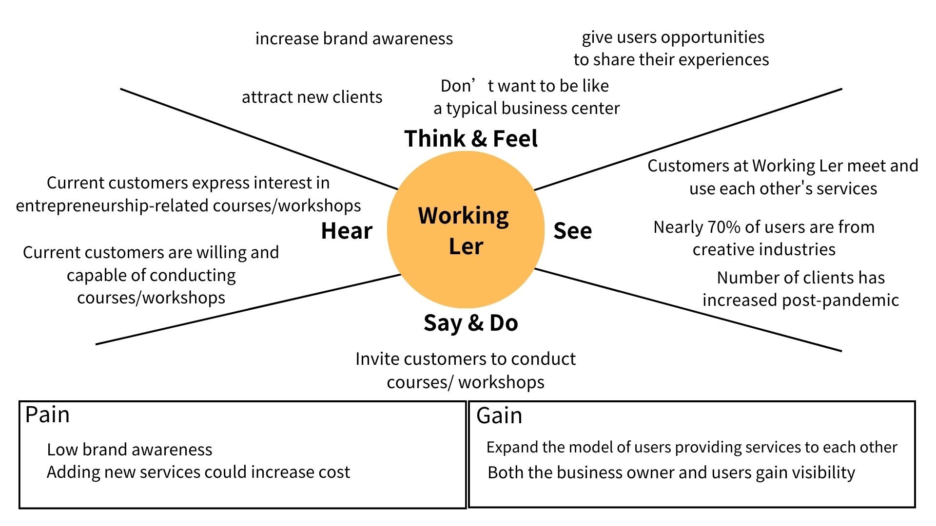To understand the core values of Working Ler and the needs of its members, we conducted stakeholder interviews and synthesized the findings into an empathy Map for both the business owners and the customers: