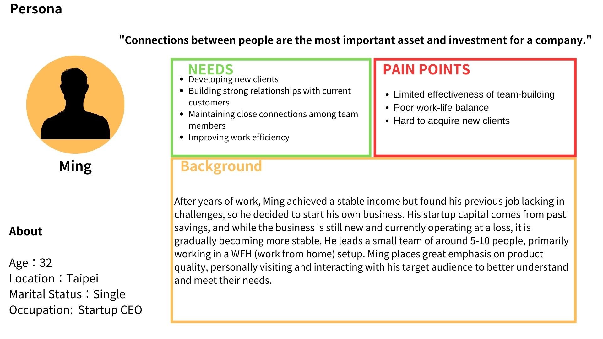 B. The Strategic Networker – Ming (32, Startup CEO) Views coworking as a business investment. He build connections within the community as potential partners and high-quality clients.