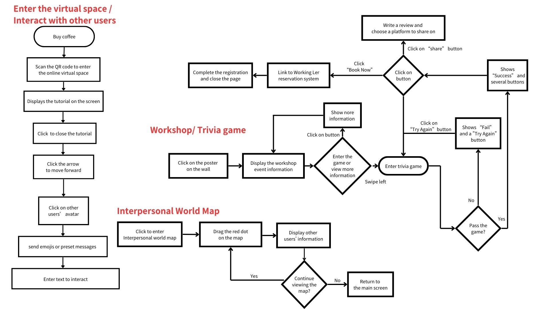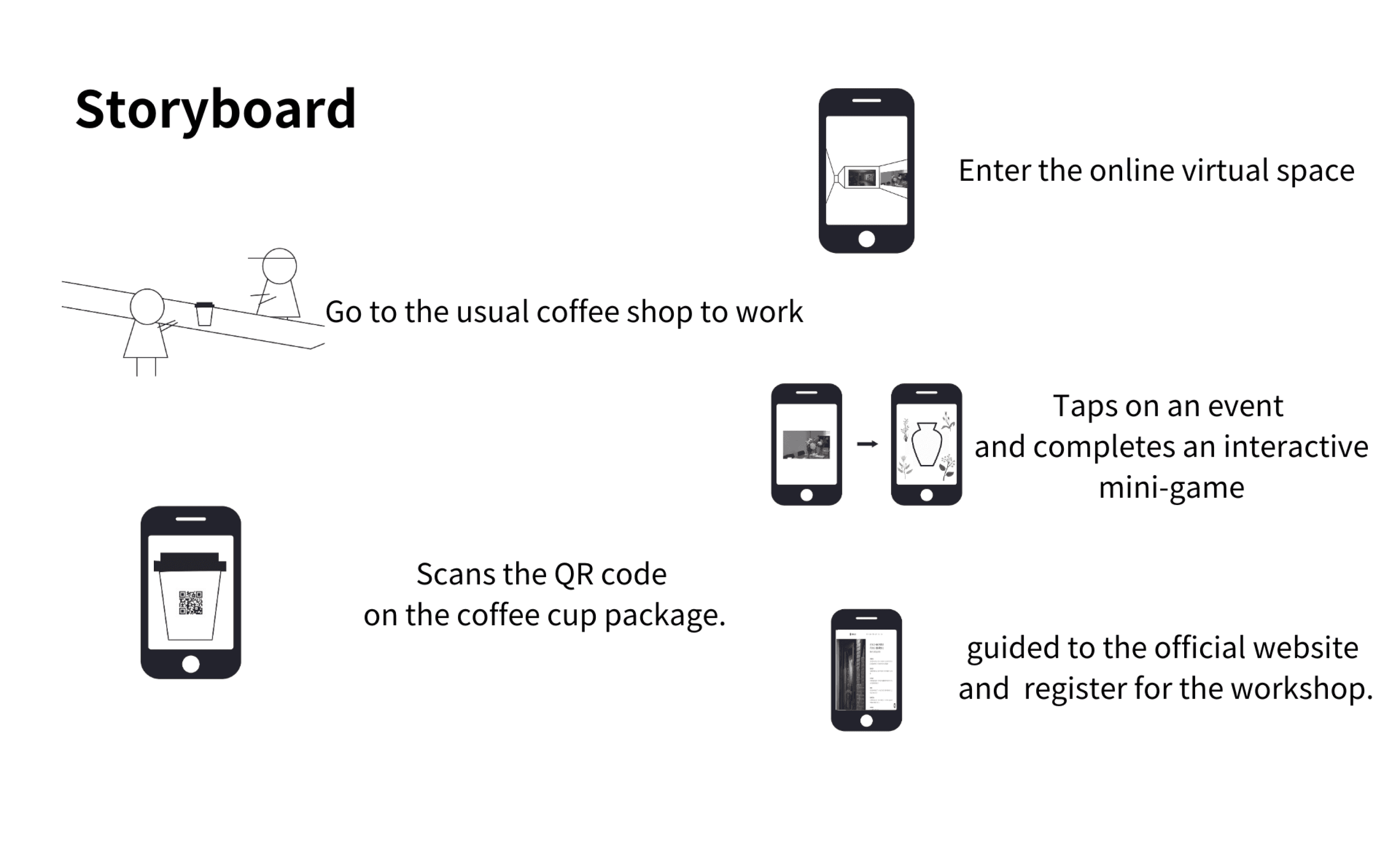 We started by the user journey at physical touch points. Coffee shops and transit hubs were selected as primary advertising touch points to target users while they are in unsatisfactory work environments. By placing QR codes on physical items like coffee cups, we capture potential members at the moment they are actively seeking a more professional and better-equipped workspace. This strategy transforms a common distraction point into a direct lead for Working Ler. Upon scanning, users are directed to a Virtual Space that simulates Working Ler’s interior. This allows them to remotely experience the atmosphere, seating, and lighting, effectively solving the 'trial barrier' before they commit to a physical visit.