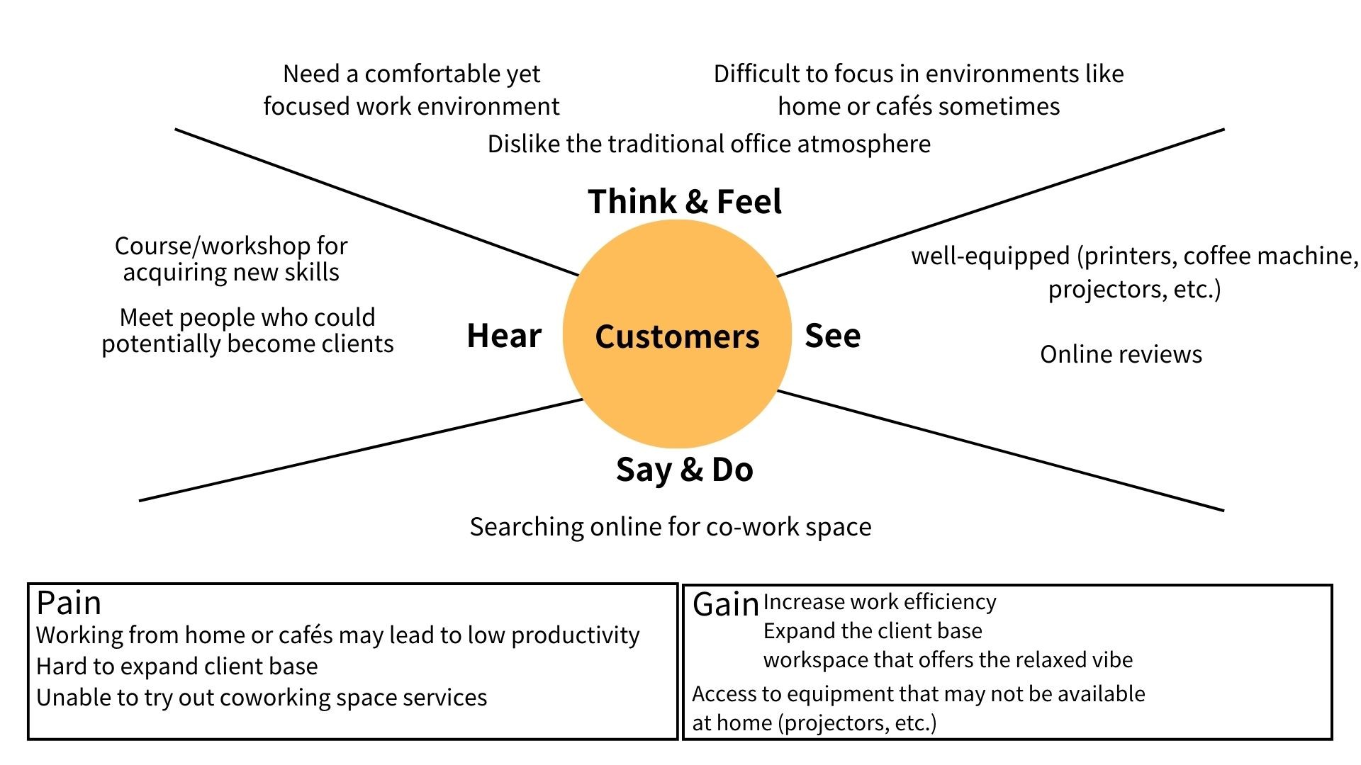 Customer Perspective: Customers are looking for a high-productivity environment that escapes the distractions of home or the lack of professional equipment in cafes. These creative professionals rely heavily on online reviews to find spaces that offer both comfort and essential infrastructure, such as printers and meeting rooms. However, a significant barrier remains the inability to experience the service before committing to a lease. Beyond physical space, users are highly motivated by the potential to expand their professional networks and acquire new skills. Their ideal journey involves finding a workspace that not only boosts their daily output but also serves as a low-pressure gateway to discovering new clients and collaborative partners.