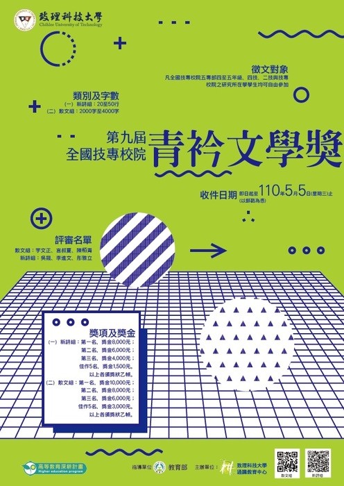 The QingJin Literature Award is a poetry and prose competition organized by Chihlee University of Technology, open to students from vocational and technical schools in Taiwan. The competition aims to encourage student creativity, promote artistic and cultural development on campuses, foster humanistic values, and discover students with outstanding literary talent from various schools.