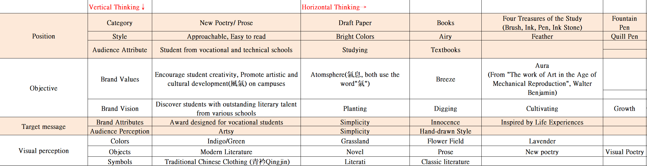 To have a deeper understanding of brand concepts and drive innovation, I utilized a vertical and lateral thinking analysis on its existing poster and design. Through vertical thinking, I performed a deep dive into the award's core identity—focusing on its target audience (vocational students) and its cultural roots (the 'Qingjin' traditional attire). This ensured the redesign stayed true to its mission of fostering literary talent. On the other hand, horizontal thinking allowed me to bridge the gap between abstract values and tangible design elements. I brainstormed lateral metaphors such as 'Planting' (Growth), 'Breeze' (Atmosphere), and 'Draft Paper' (Creation) to create a rich visual vocabulary for the brand.